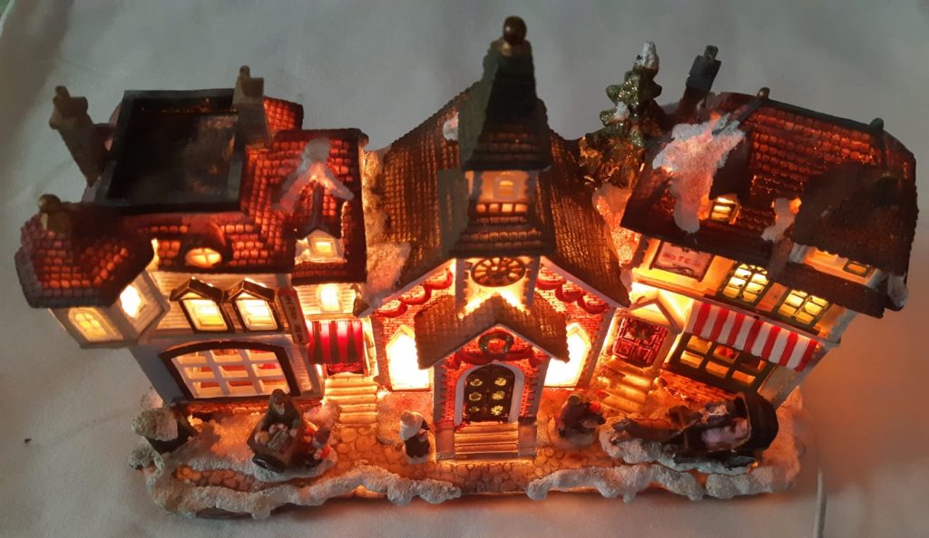 LED lights illuminate Town scene, great addition to a mantel or table top; Scene is the perfect addition to your Christmas décor. Dimensions: L 31.5 cm; W 12 cm; H 24 cm.
